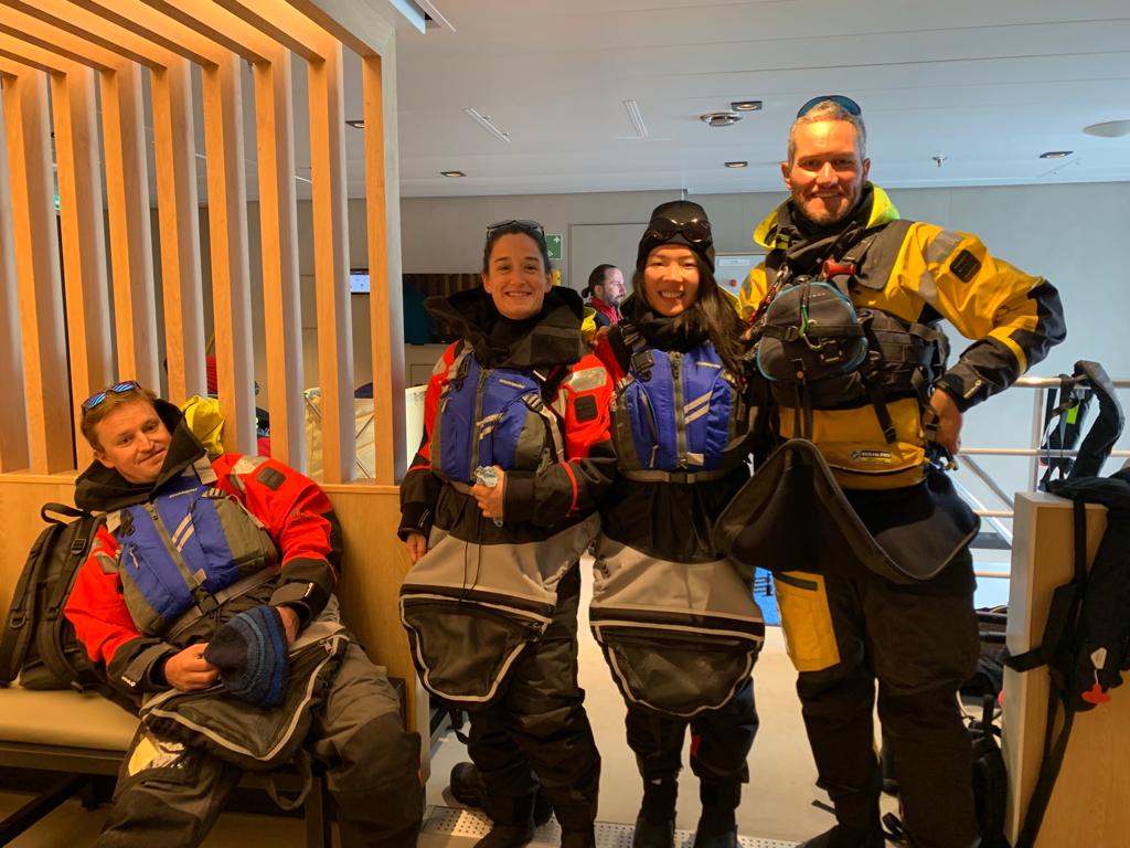 We set off from the ship in our safety zodiac around half an hour before the rest of the passengers (8.30 am), already dressed in the provided dry suits. Several meters away from the ship, and with extreme care, one by one we started to transfer from the boat to the kayaks. Although it wasn’t hard, you need to be quite fit to get into the kayak itself, as you have to lower yourself from the zodiac down into the kayak and then grab the paddle to move away from the zodiac.