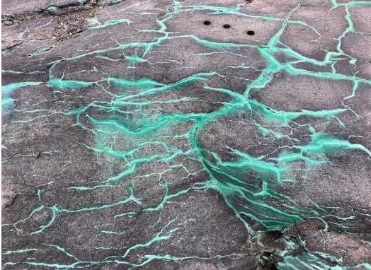 Second, we saw very cool metamorphic rocks, mostly gneisses, which frequently have a banded appearance. We also saw some rocks of volcanic origin mostly basaltic lavas and pyroclastic rocks. There are bright green copper ore cracks in these rocks.