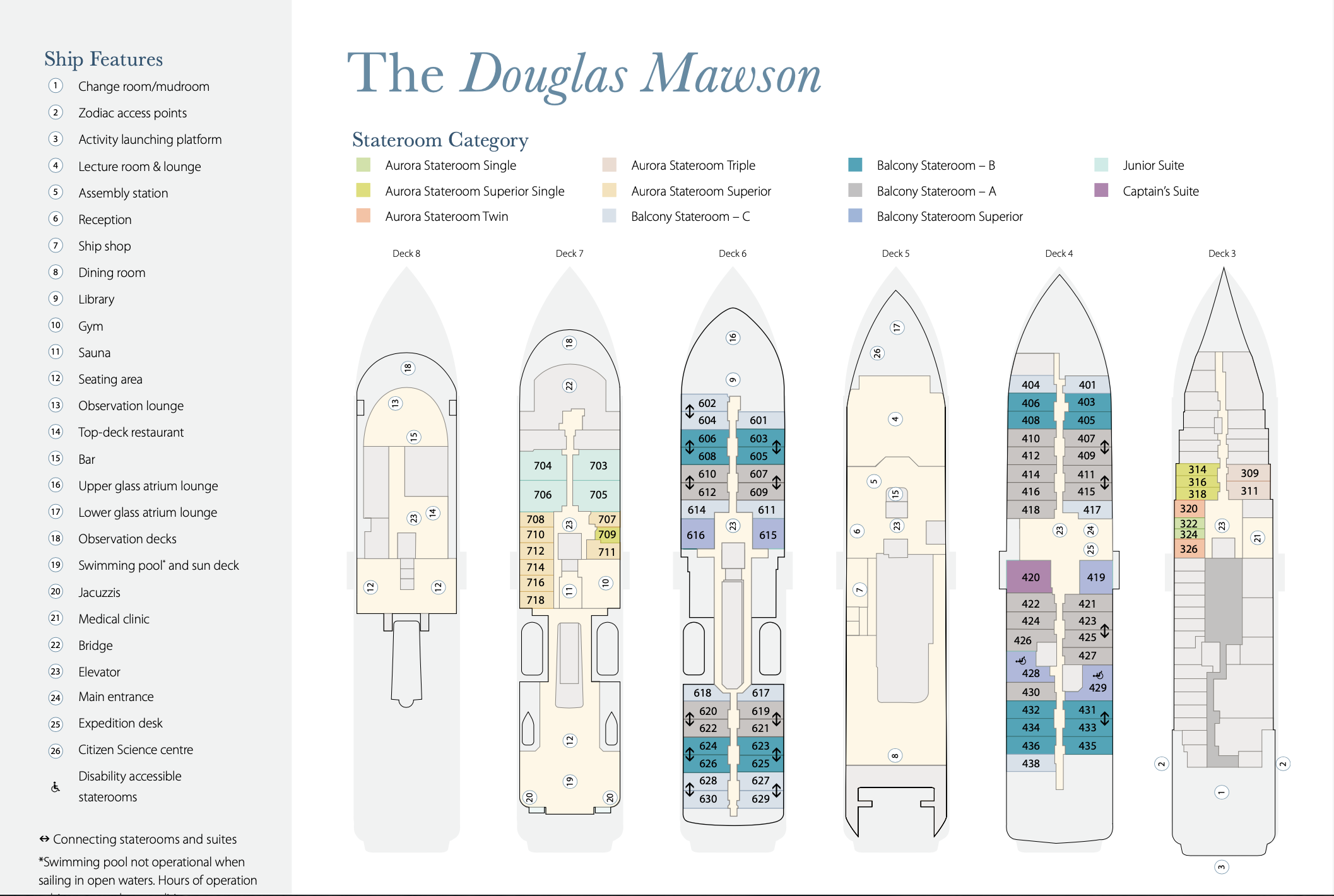 The Douglas Mawson, setting sail in 2025, redefines small ship expedition cruising. Designed for global exploration with enhanced sustainability features, it accommodates up to 154 guests on cruises and 130 adventurers on expeditions. It features the innovative Ulstein X-BOW® and a wide range of staterooms, including single staterooms. Amenities include a heated outdoor swimming pool, two Jacuzzis, a gym, a sauna, a Citizen Science Centre, and two restaurants, along with multiple observation areas to enjoy landscapes and wildlife.