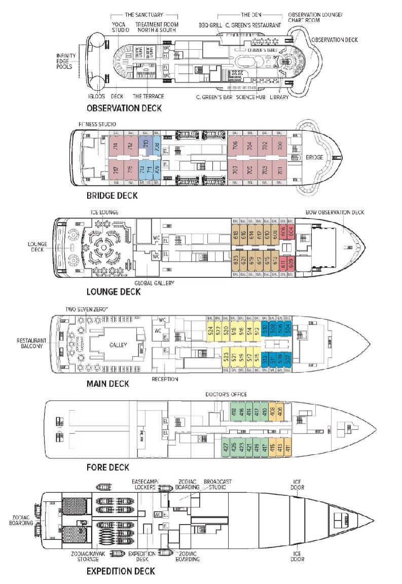 Reception; three dining areas; an observation lounge with bar, gym, wellness area, infinity-style outdoor hot tubs with adjacent igloos; library; main lounge with full service bar, 24-hour beverage station,state-of-the- art tech for films/presentations; B&H Photo locker and a photo workshop area; science hub; an onboard broadcast studio; an expedition base with lockers for expedition gear; and open access to the Bridge, Captain, officers and on-duty wildlife spotters.